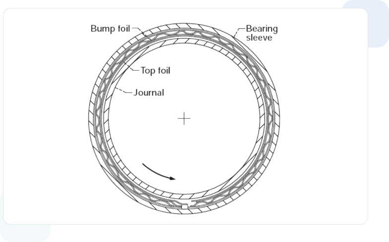 Air foil bearings are advanced gas bearings designed for high-speed applications. A compliant, spring-loaded foil lining supports the rotating shaft. At high speeds, air is drawn into the gap, creating a pressurized film that eliminates contact between the shaft and foil, resulting in zero wear. These self-starting bearings require no external pressurization, making them ideal for turbines, compressors, and other high-speed systems. Their low friction and high durability enhance efficiency and reliability in demanding industries like aerospace and energy.